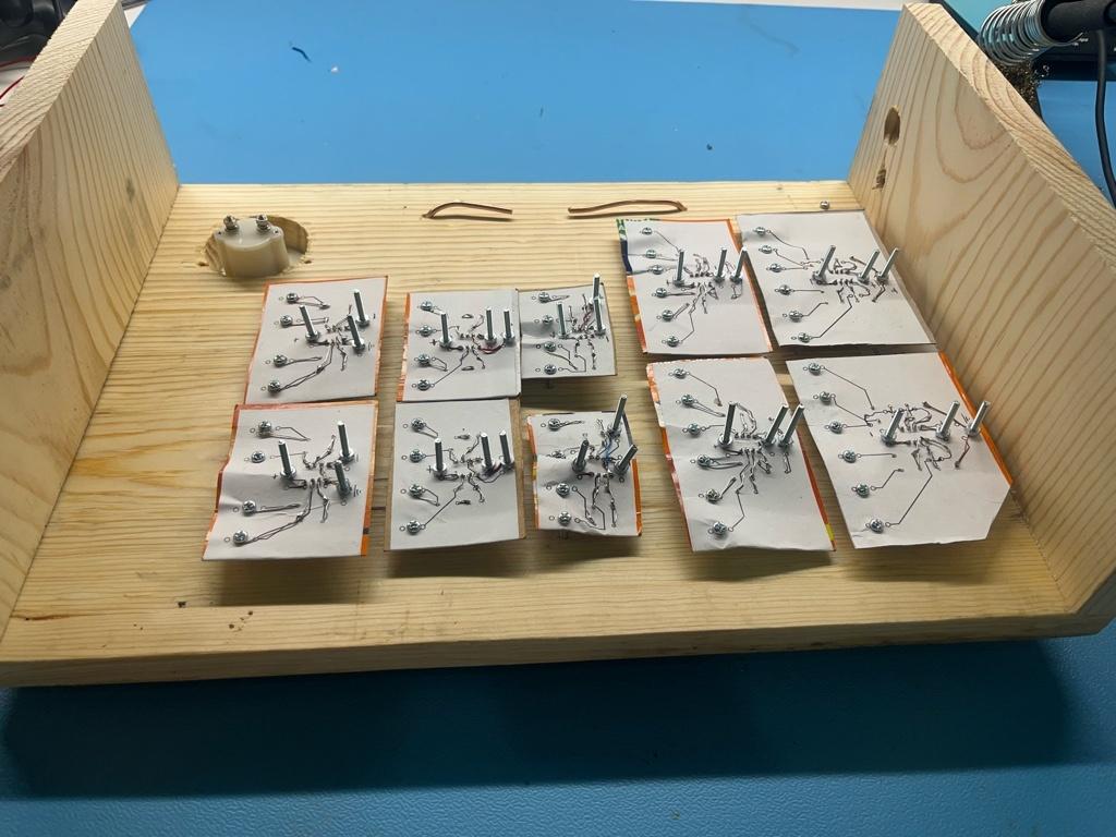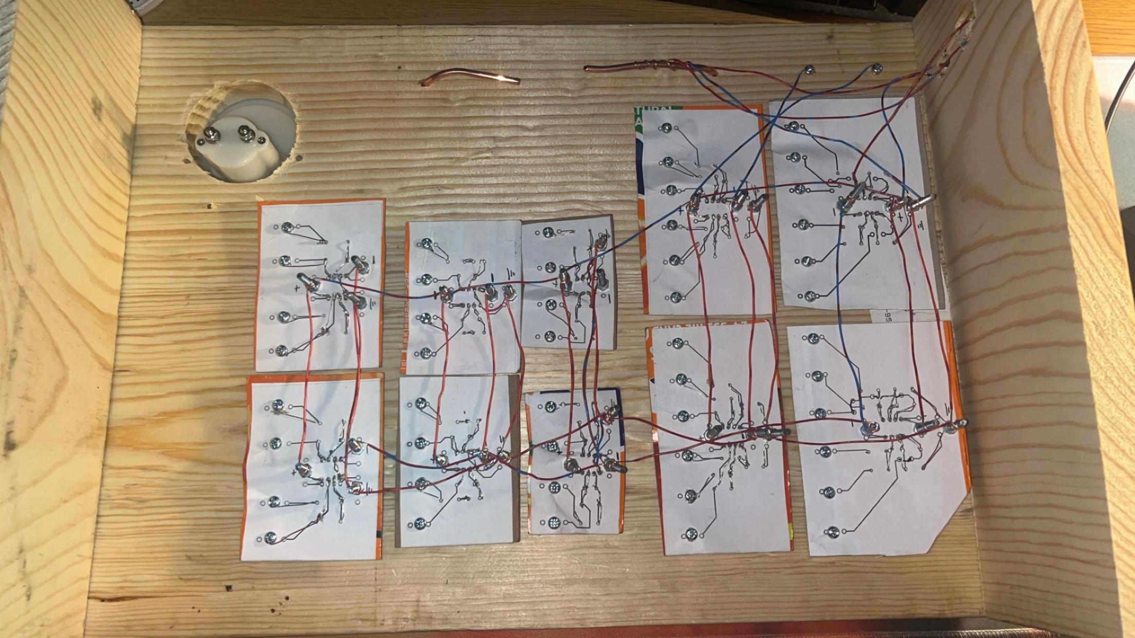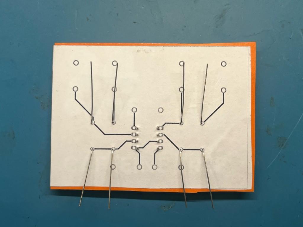 Place all the paper circuits through the drilled holes, they all had a good friction fit. I also added a large ground rail wire at the top.