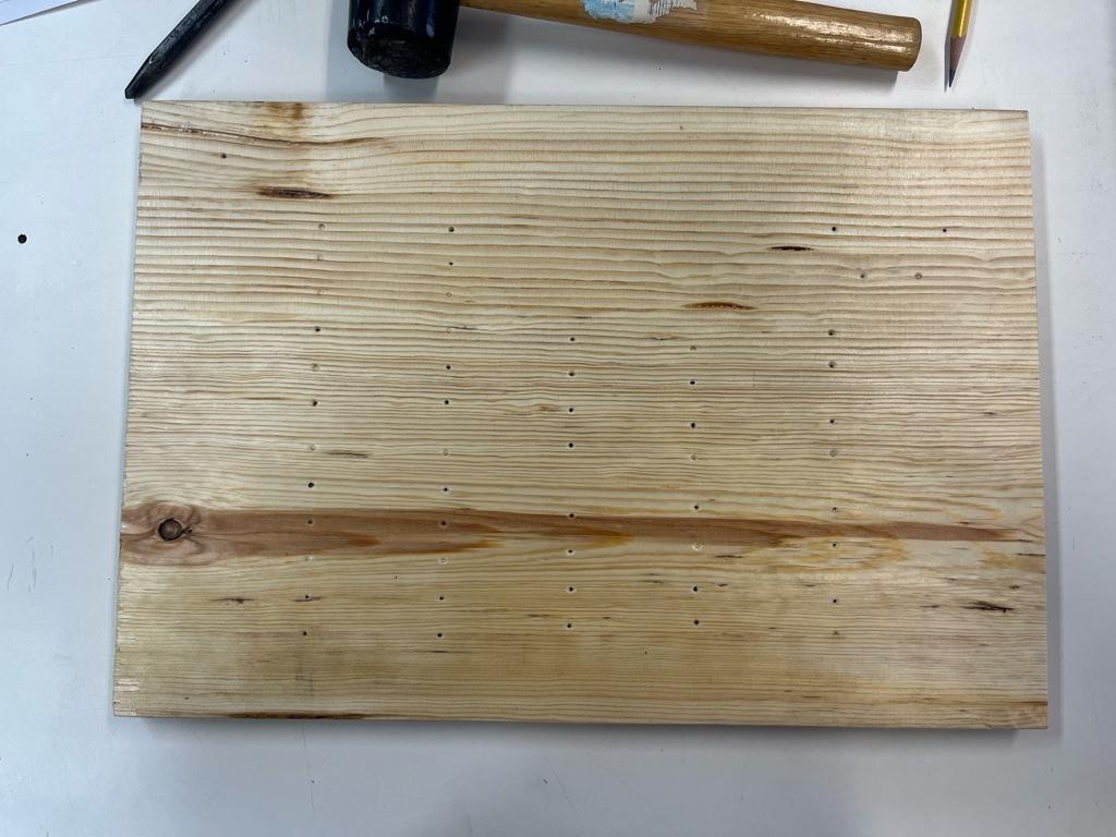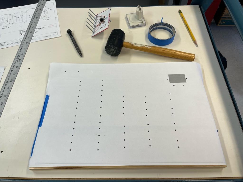 After printing out the panel layout, I taped it to the board and punched the hole template into the wood.