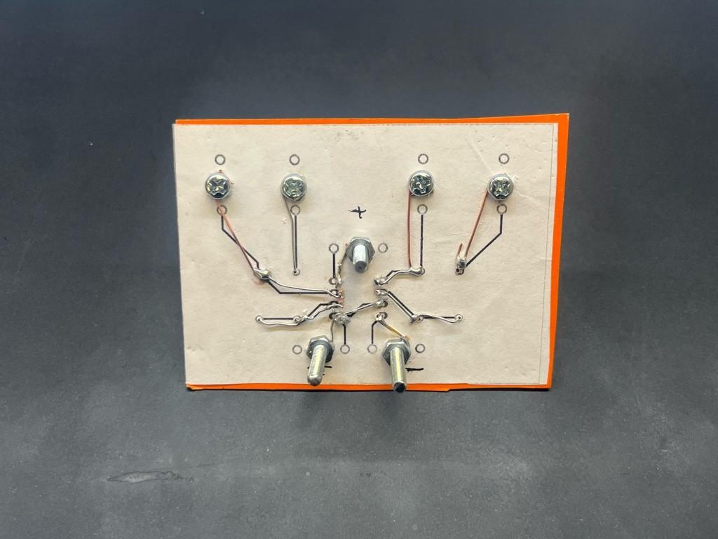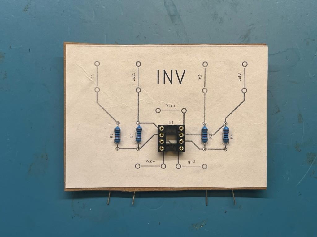 The circuits use the TL082 chip with resistors and capacitors built on paper circuit. The inputs/outputs are screws that alligator clips can clip onto.